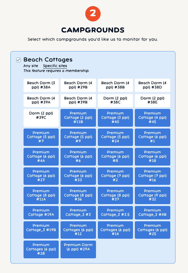 Tell us when, where, and how long you want to camp for. We’ll notify you (via SMS) when a suitable spot opens up at that campground—so you can nab that sold-out campsite reservation!