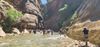 Next we took the shuttle to the Narrows. The Narrows was of course vey crowded. It is incredibly popular and cool due to the river and the shade from the cliffs. We probably hiked about a mile and a half up the Narrows before turning around. Apparently you can rent gear; wooden pole, water shoes, etc, but we just used our own stuff. I would definitely look into getting the wooden walking stick as my trekking poles kept being pushed over by the current.